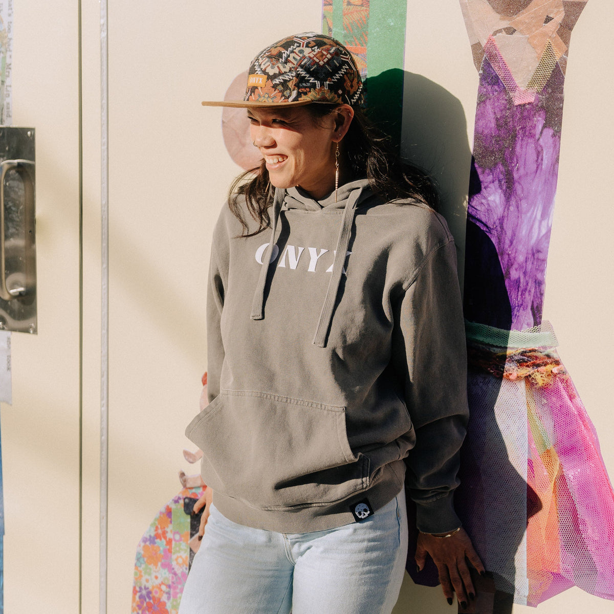 - Skull motif tag near the lower left waistline