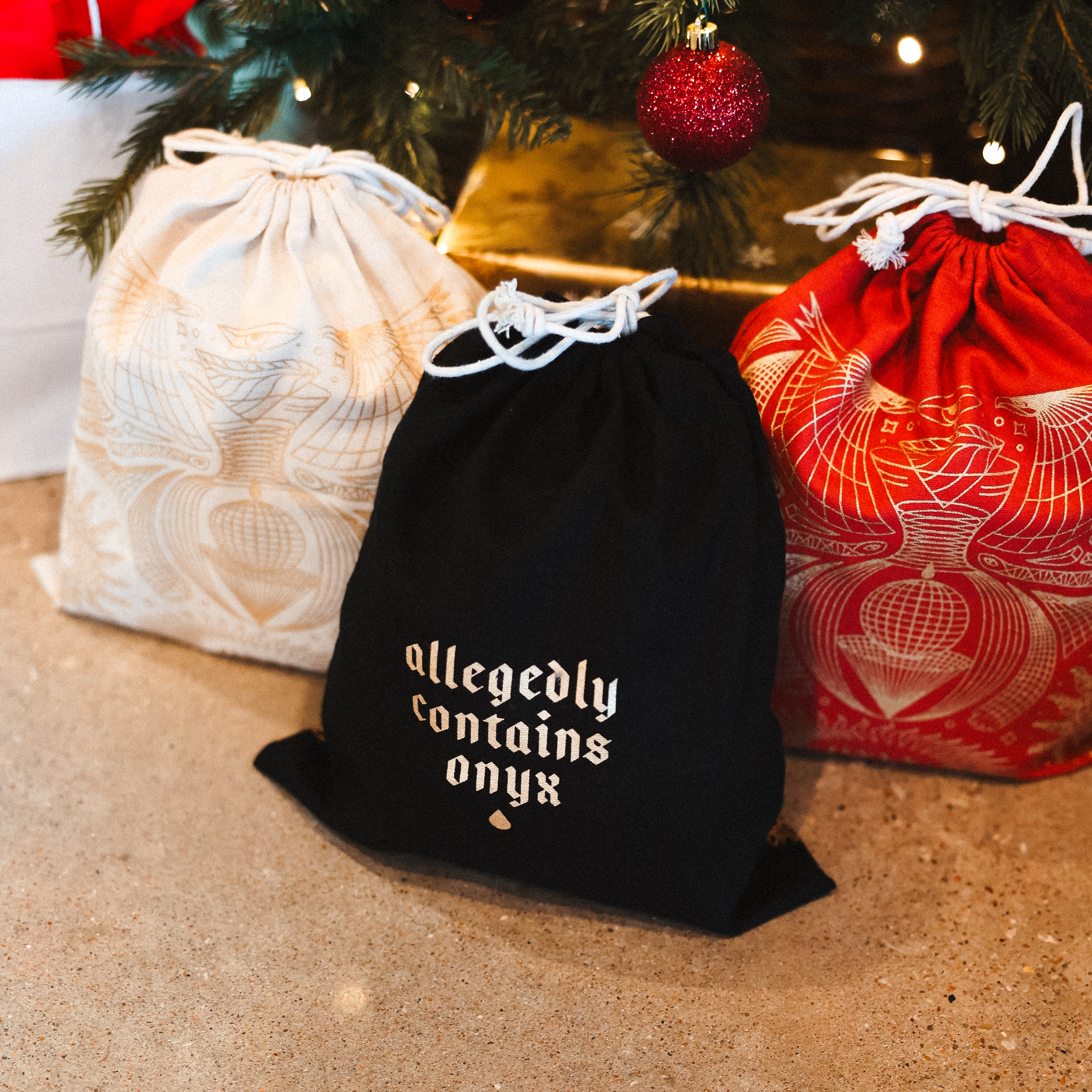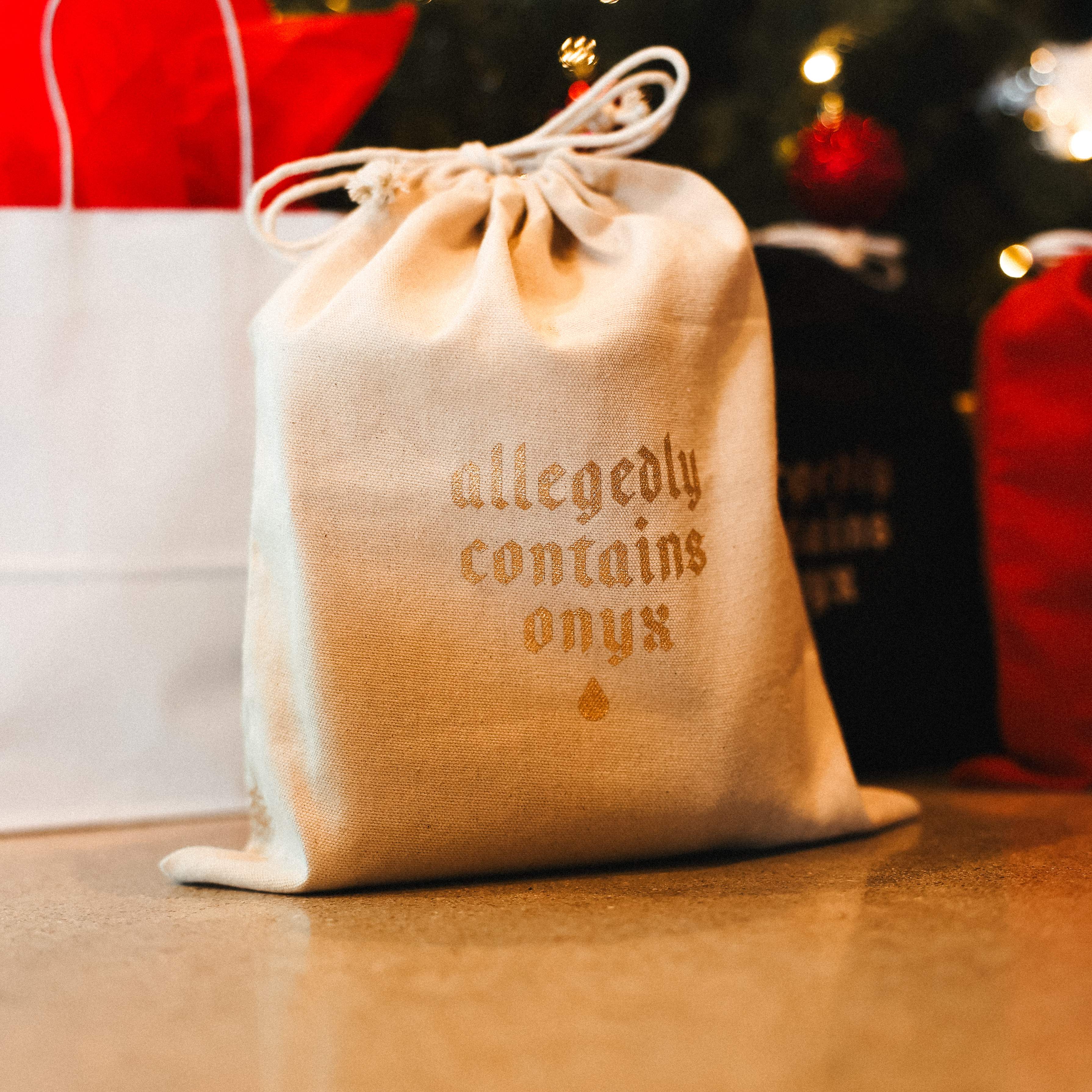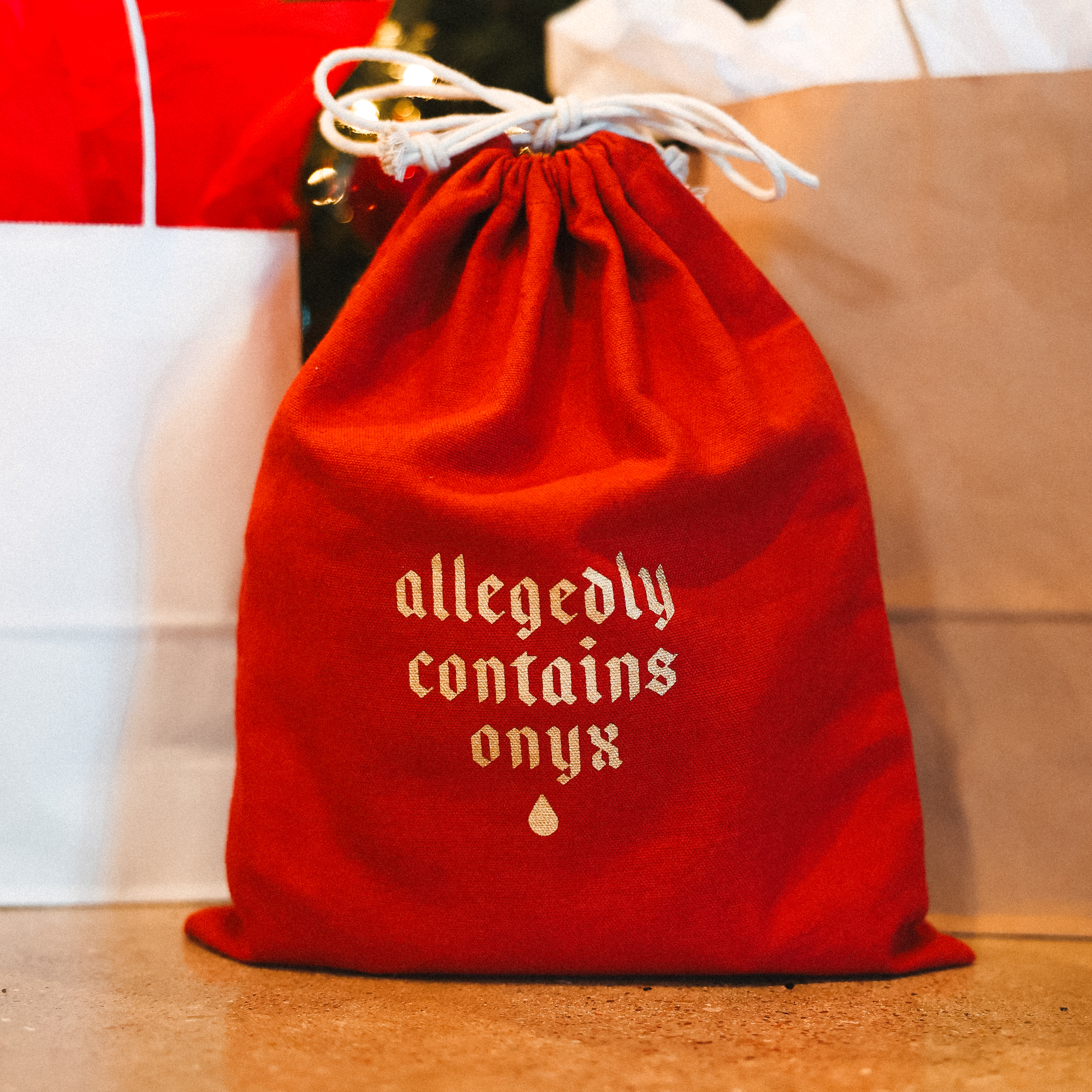 Don't just plan to give the gift of Onyx–build anticipation by letting your family and friends imagine what may be in inside. Decorated with custom artwork on one side and an "allegedly contains onyx" type lockup on the other, these gift bags are available in three colors.