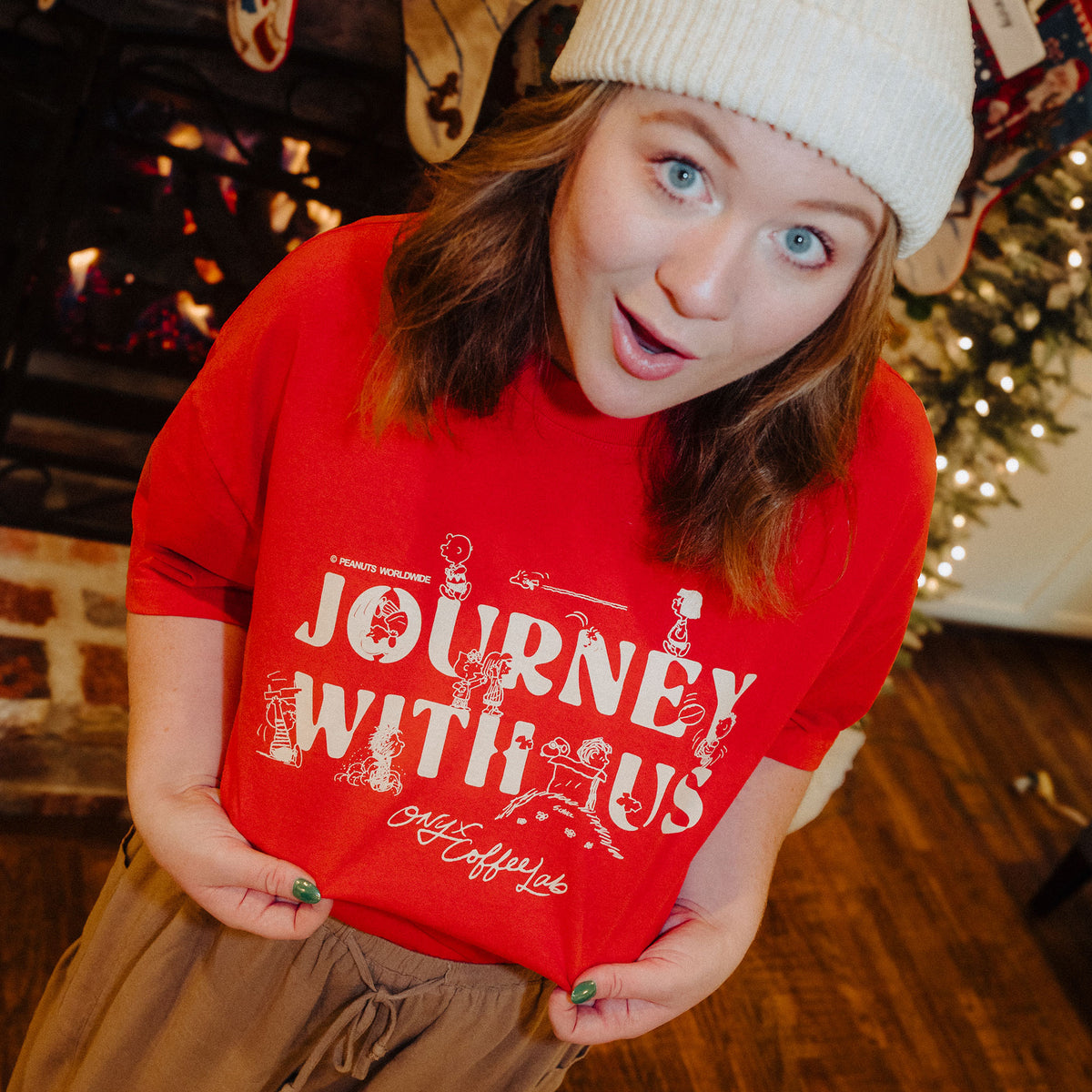 Join Charlie Brown, Snoopy, and the rest of the gang on their next big adventure with the Journey With Us Peanuts Tee. This oversized red tee brings the excitement of exploration to life, with various Peanuts characters running, playing, and setting out for adventure. The phrase “Journey with Us” invites fans of all ages to embrace the spirit of discovery — whether that’s exploring the great outdoors or trying a new coffee. Made with soft, breathable fabric, this loose-fitting tee is perfect for long days, casual outings, or cozy nights at home. Wherever you go, the Peanuts crew is ready to tag along.