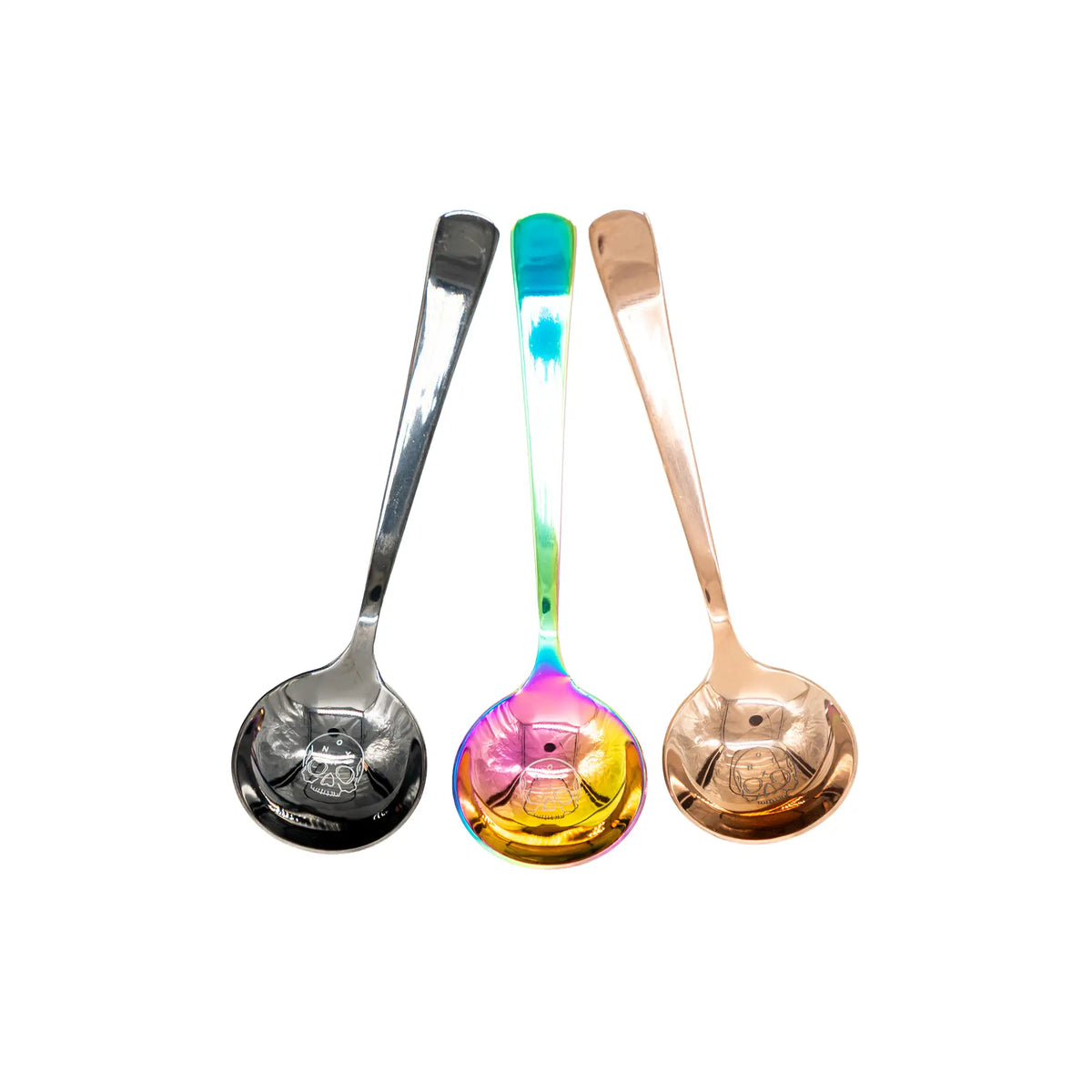 They feature an Onyx skull in the bowl of the spoon. And on the back of the handle, it says, "NEVER SETTLE". Choose from Rainbow, Black, and Rose Gold (more gold than rose gold IMHO)